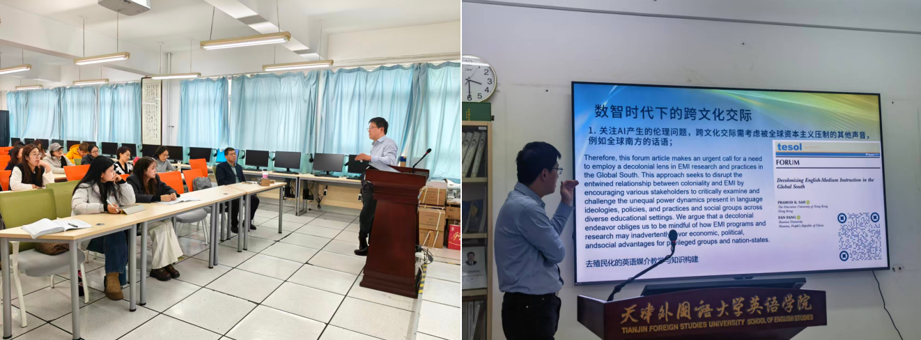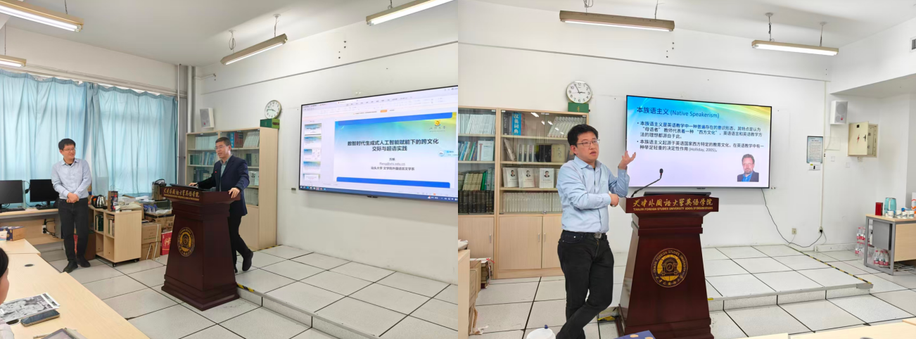 11月26日下午,汕头大学方帆教授应邀做客天津外国语大学英语学院,为师生带来了主题为“数智时代生成式人工智能赋能下的跨文化交际与超语实践”的专题讲座。本次讲座由天津外国语大学英语学院副院长郑思明主持,校内外语专业师生聆听了讲座并与方教授积极互动。