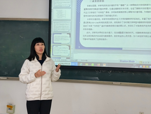 隋亚男博士则以《英国现代主义文学的静默美学研究》为题,就其主持的国家社科基金青年项目的最终成果进行了汇报。她从研究背景与意义、主要内容与核心观点、学术价值与社会影响等多个方面,介绍了其共计21万字的专著成果。该著作结构严谨,共设四个主体章节:导论“静默的现代主义”在梳理相关理论谱系的基础上,深入剖析了现代主义文学何以发生“静默转向”的内在机理与其美学核心内涵;后续三章分别从视觉书写、叙事策略、作品主题等维度,论证了静默美学在英国现代主义文学中的具体表现形态与艺术功能。她强调,对这一美学范式的深入探究,不仅有助于回归文学本体,重新审视语言、形式与意义的关系,更能揭示“审美现代性”在面对高速发展的“物质现代性”时所展现出的批判与反思力量,从而为理解现代文学抵抗现实物化的精神向度提供新的理论视角。